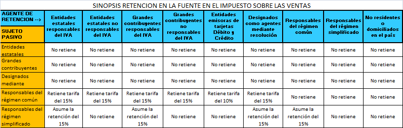 Teniendo en cuenta lo anterior, si por ejemplo una empresa catalogada como S.A.S. (régimen común) le compra mercancias gravadas a un responsable también del regimen común, en ese caso no le aplica ninguna retención por concepto de IVA, puesto que la sinopsis indica que la retención se aplica al contribuyente que está en rango menor al del comprador, y en el caso del ejemplo, tanto comprador como vendedor estan en la misma linea (régimen común).